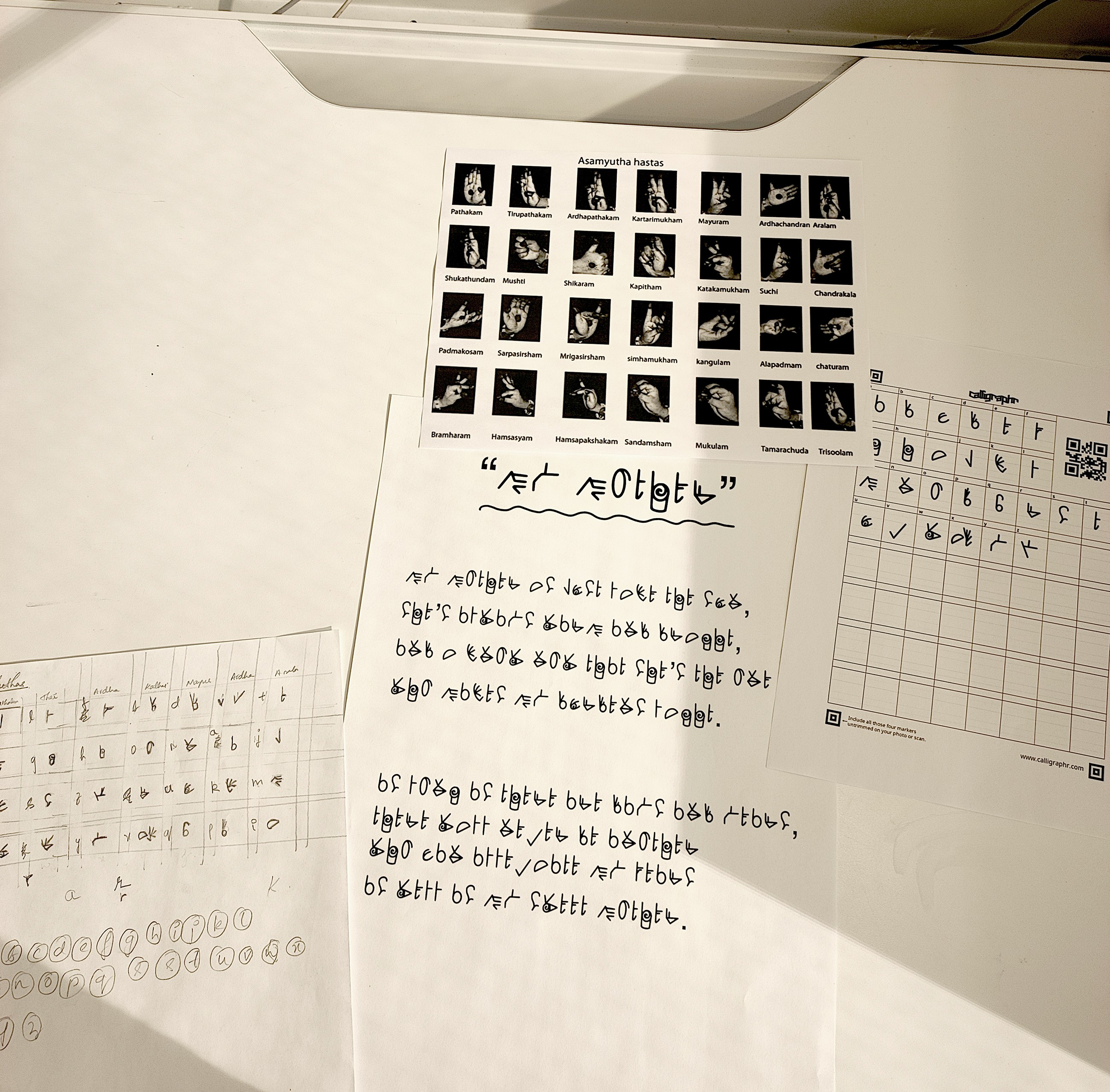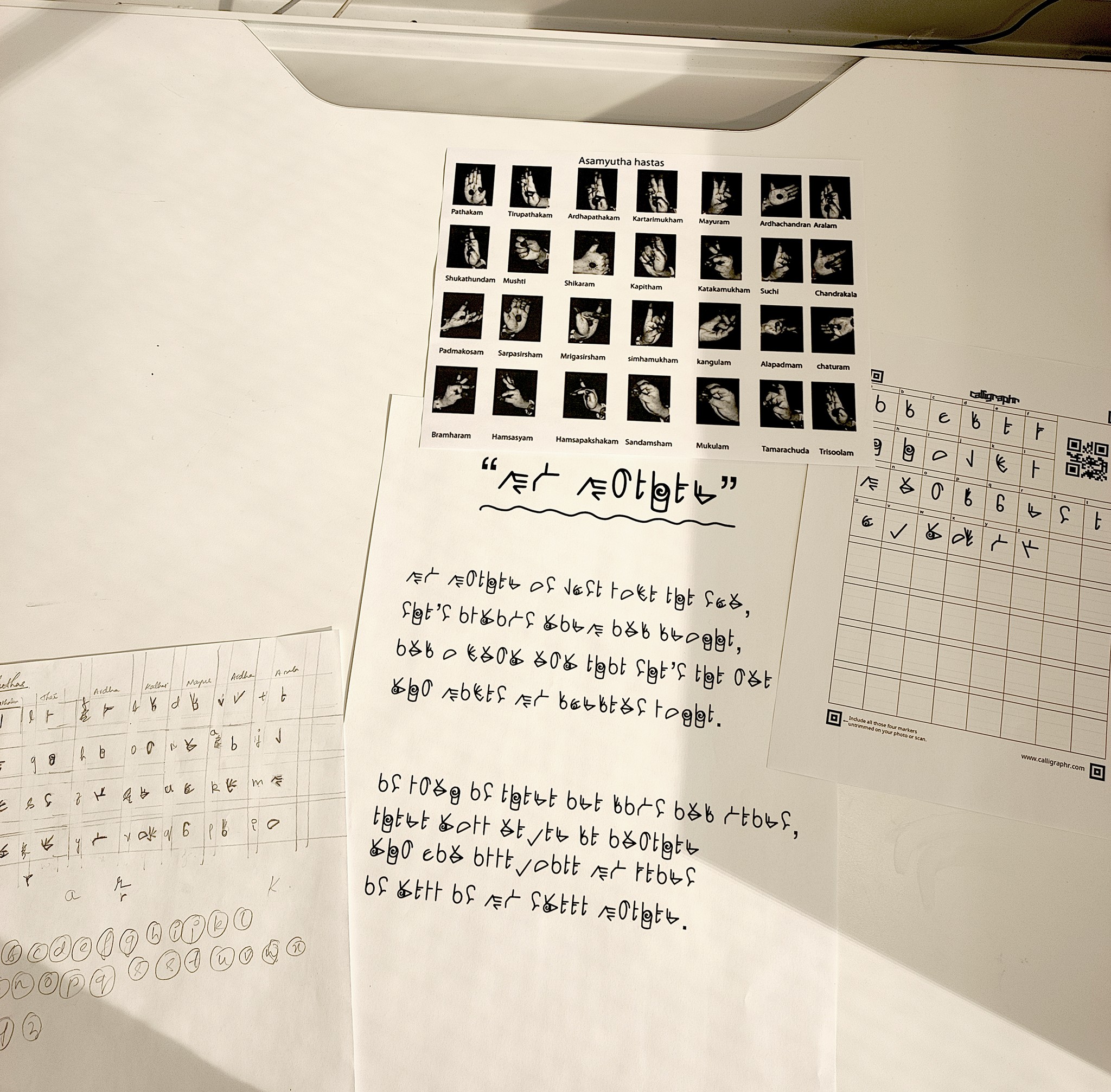 "Hasthagalu" font is a generative font inspired by Asamyutha Hasthas, the single-hand gestures used for storytelling in the South Indian classical dance form, Bharatanatyam. This image showcases a poem I wrote for my mother using the Hasthas font.